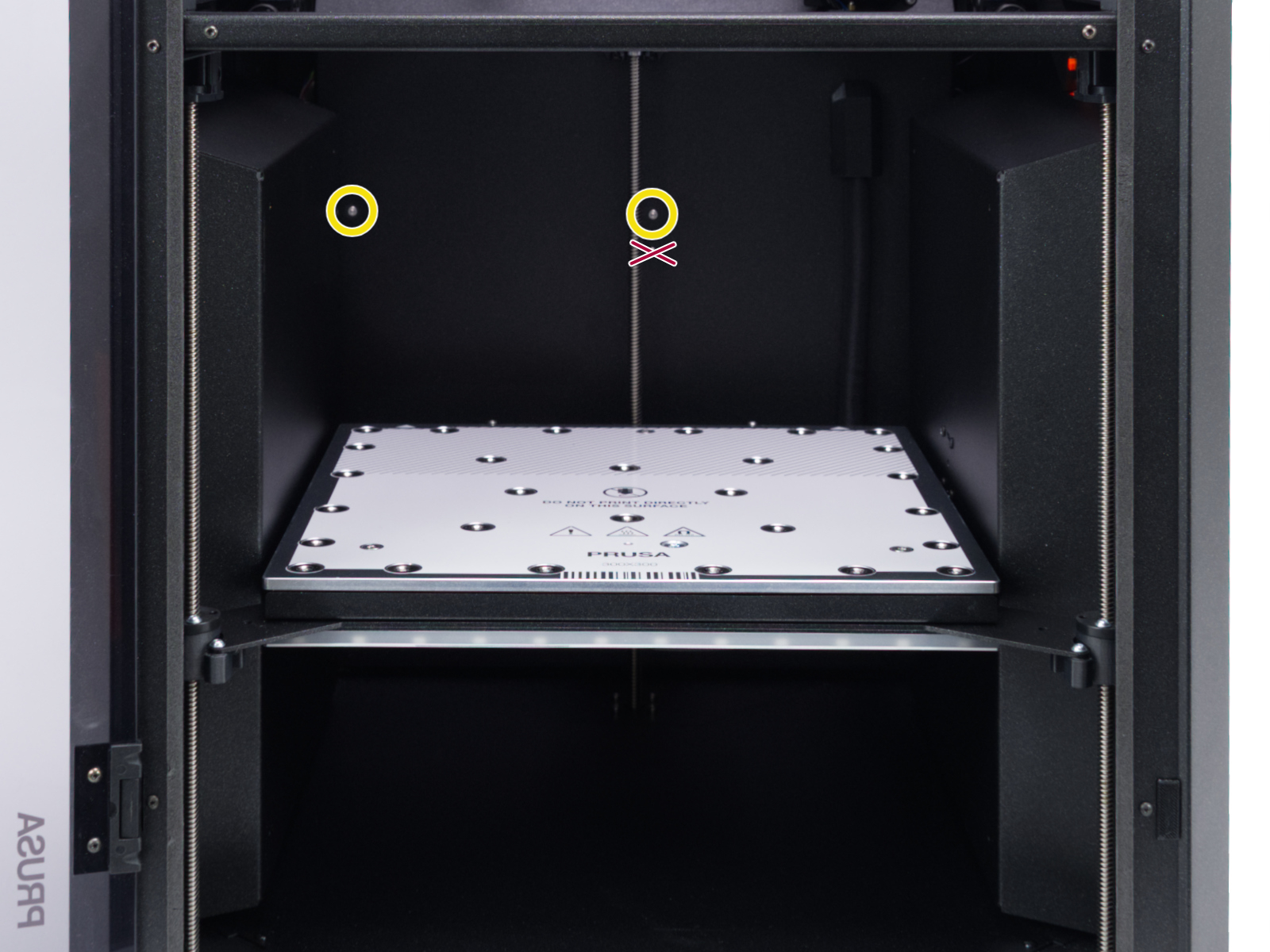 Check the heatbed cables. Inside the printer chamber, use the T10 screwdriver to remove the two M3x4rT screws that hold the electronics cover in place. Be careful not to loosen the lower middle screw. It should stay tightened.